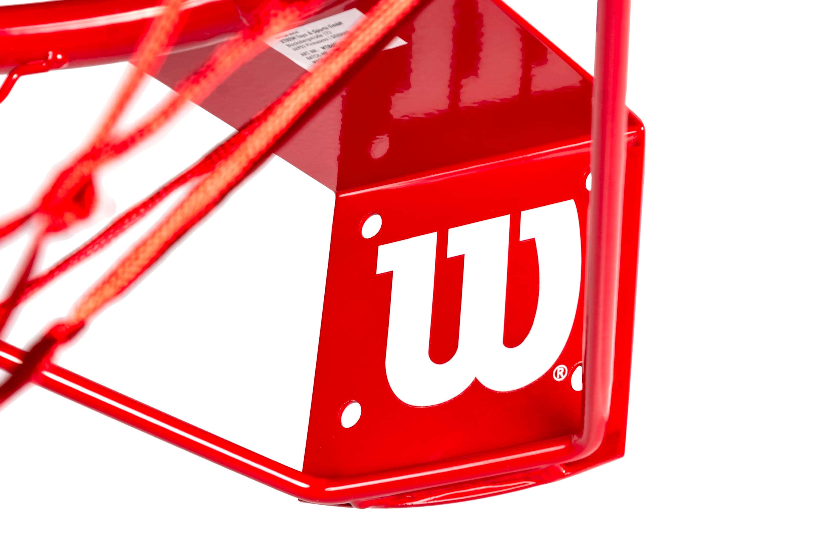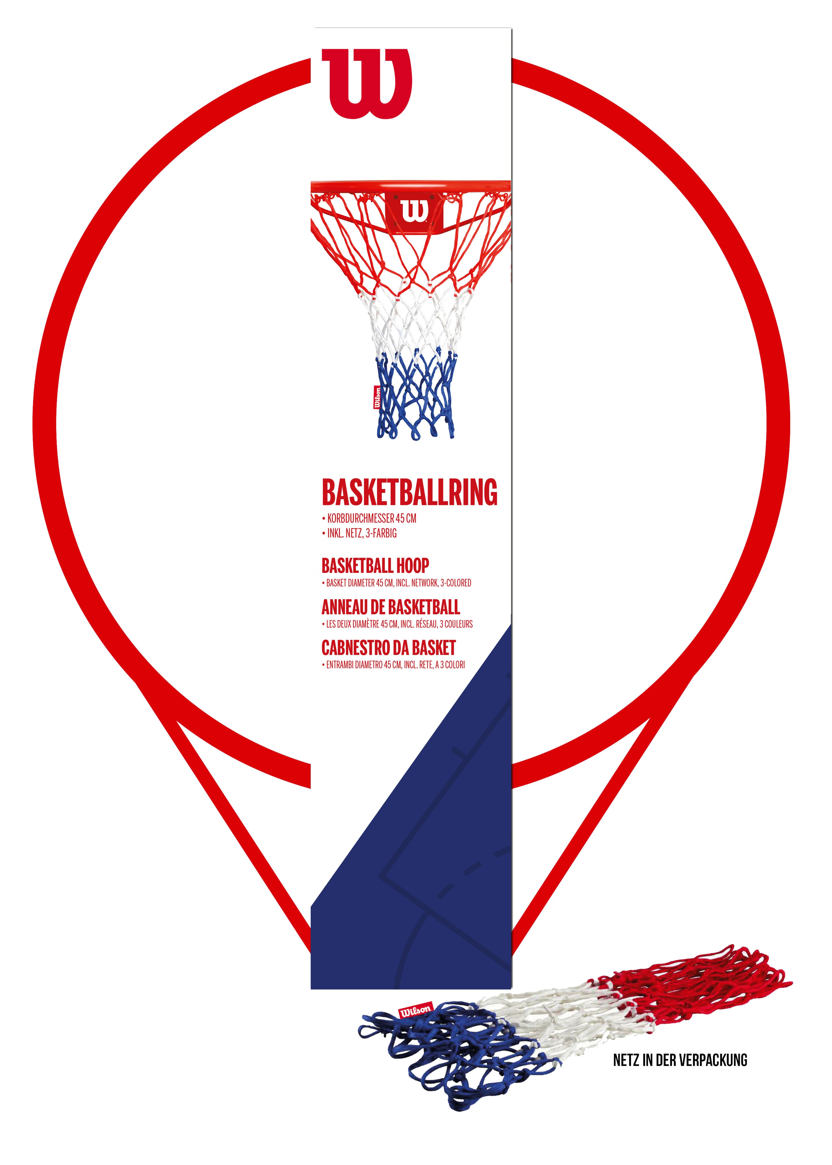 Für's Training zuhause: Metallener pulverbeschichteter Basketballring von Wilson mit einem Durchmesser von 45 cm aussen und 42 cm innen. Inklusive dreifarbigem Polyesternetz von 53 cm Länge. Vier Befestigungsschreiben (Wandabstand 13 cm) gehören zum Lieferumfang. Nettogewicht: 1,7 kg.