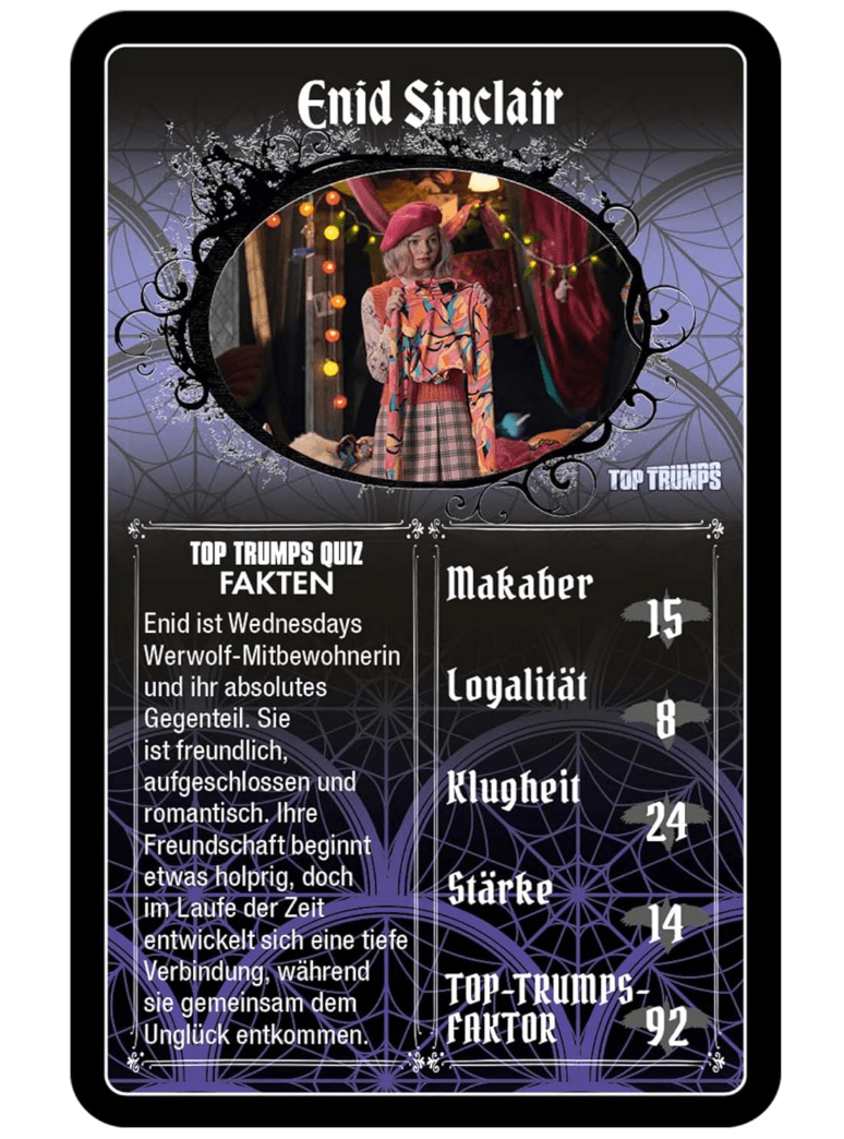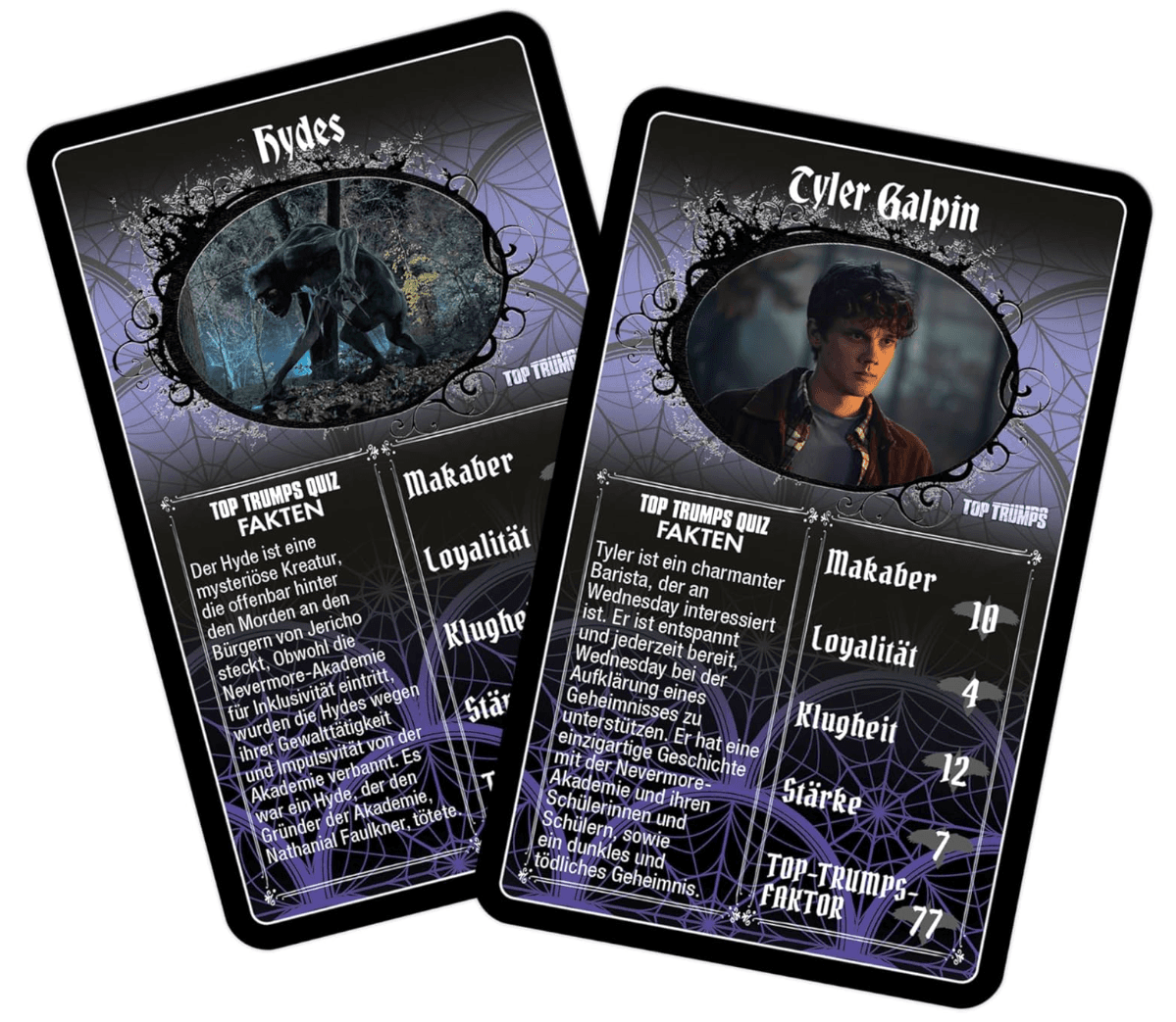 Tauche ein in die düstere Welt der Nevermore Academy und spiele mit deinen Lieblingscharakteren aus der erfolgreichen Netflix-Serie „Wednesday“! Das Top Trumps Kartenspiel von Winning Moves bringt 30 Charaktere wie Wednesday Addams, Enid Sinclair, Bianca Barclay und Xavier Thorpe in einem spannenden Duell zusammen.