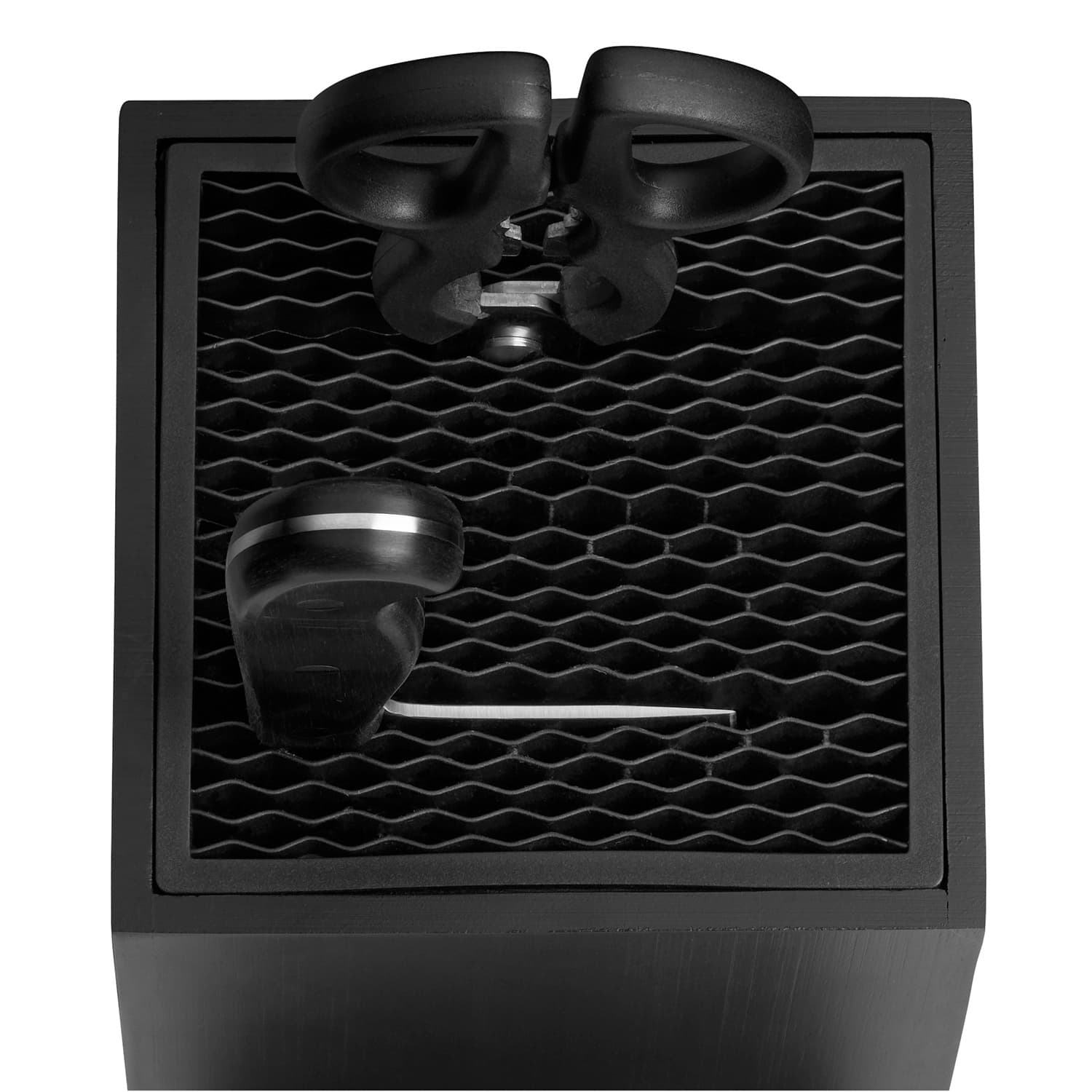 Der spezielle, klingenschonende FlexTec Einsatz hält die Klingen sicher an ihrem Platz, extrabreite Aufnahmen ermöglichen dabei die Aufbewahrung von Haushaltsscheren und sogar großen und breiten Klingen, wie beispielsweise eines Chinesischen Hackmessers.