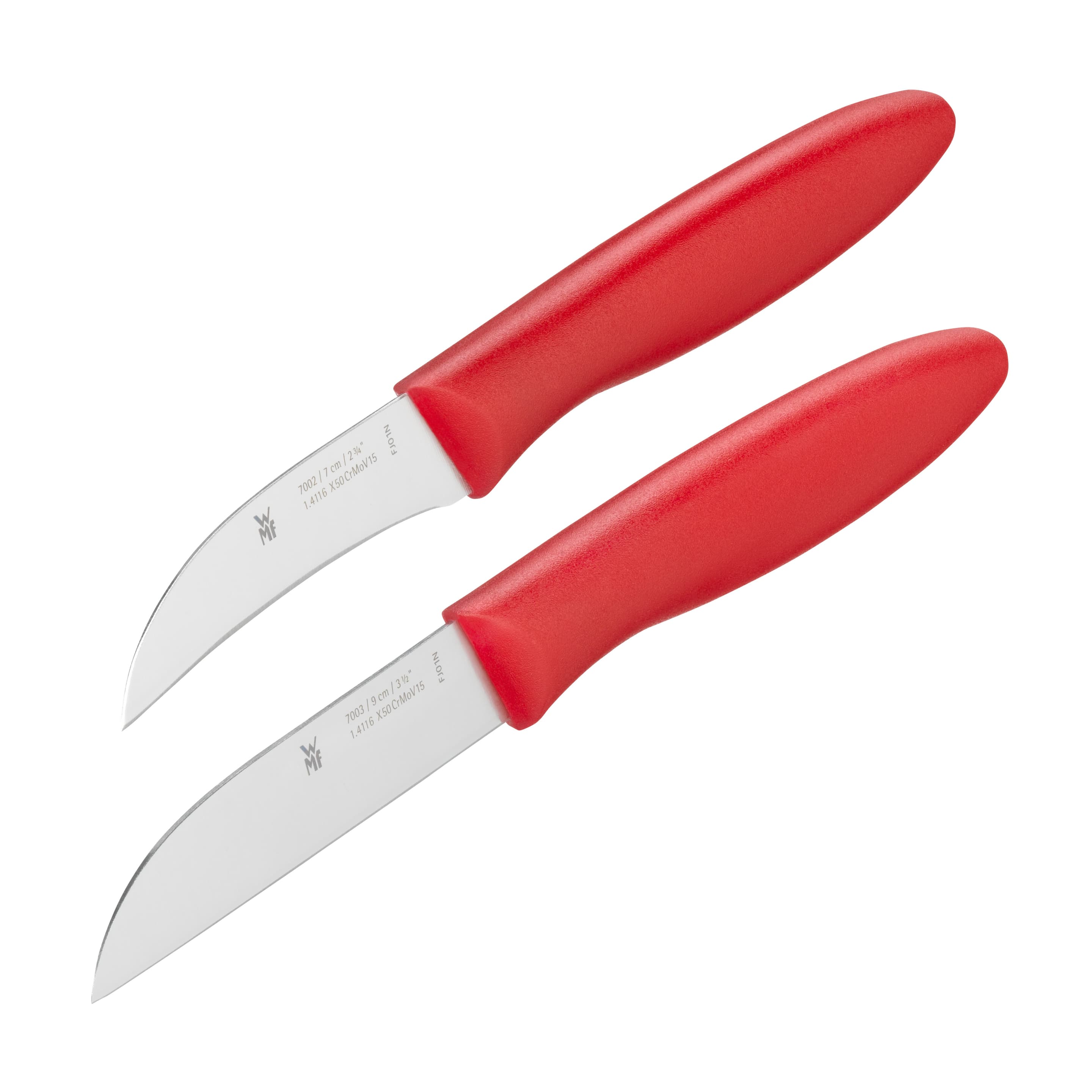 Ideal für den Küchenalltag, zum Schneiden und Schälen von Obst und Gemüse und mit leuchtend roten, ergonomisch geformten Griffen für eine sichere und komfortable Handhabung: Das 2-teilige Gemüsemesser-Set von WMF. Das Set besteht aus einem Gemüsemesser mit 7 cm Klingenlänge sowie einem Schälmesser mit 9 cm langer Klinge– jeweils gehärtet und mit lange anhaltender Schärfe und Langlebigkeitüberzeugend. Ob härtete oder weichere Zutaten, obÄpfel, Birnen, Bananen oder Kartoffeln, Gurken und Zucchini, selbst empfindliche Tomaten oder Avocados werden sauber und präzise geschnitten oder geschält. Und nach getaner Arbeit dürfen die hochwertigen Messer auch gerne zur Reinigung in die Spülmaschine.