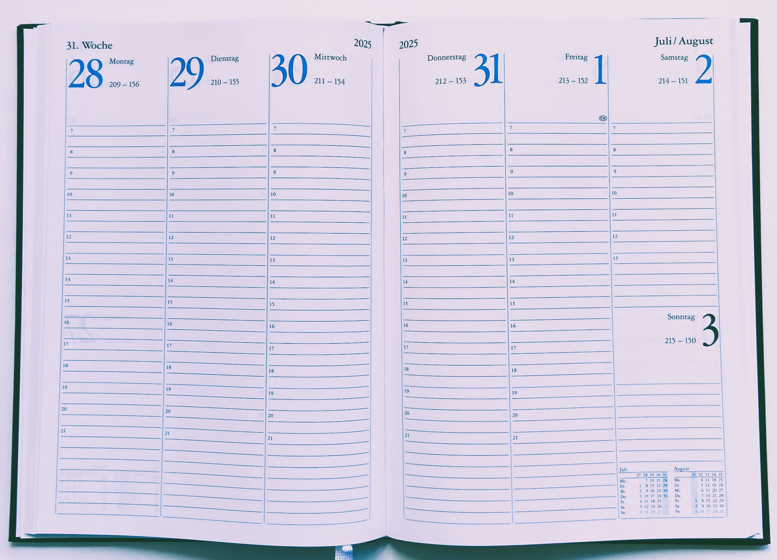 Kalender-Buch im A5 Fomat, 1 Woche/2 Seiten.
