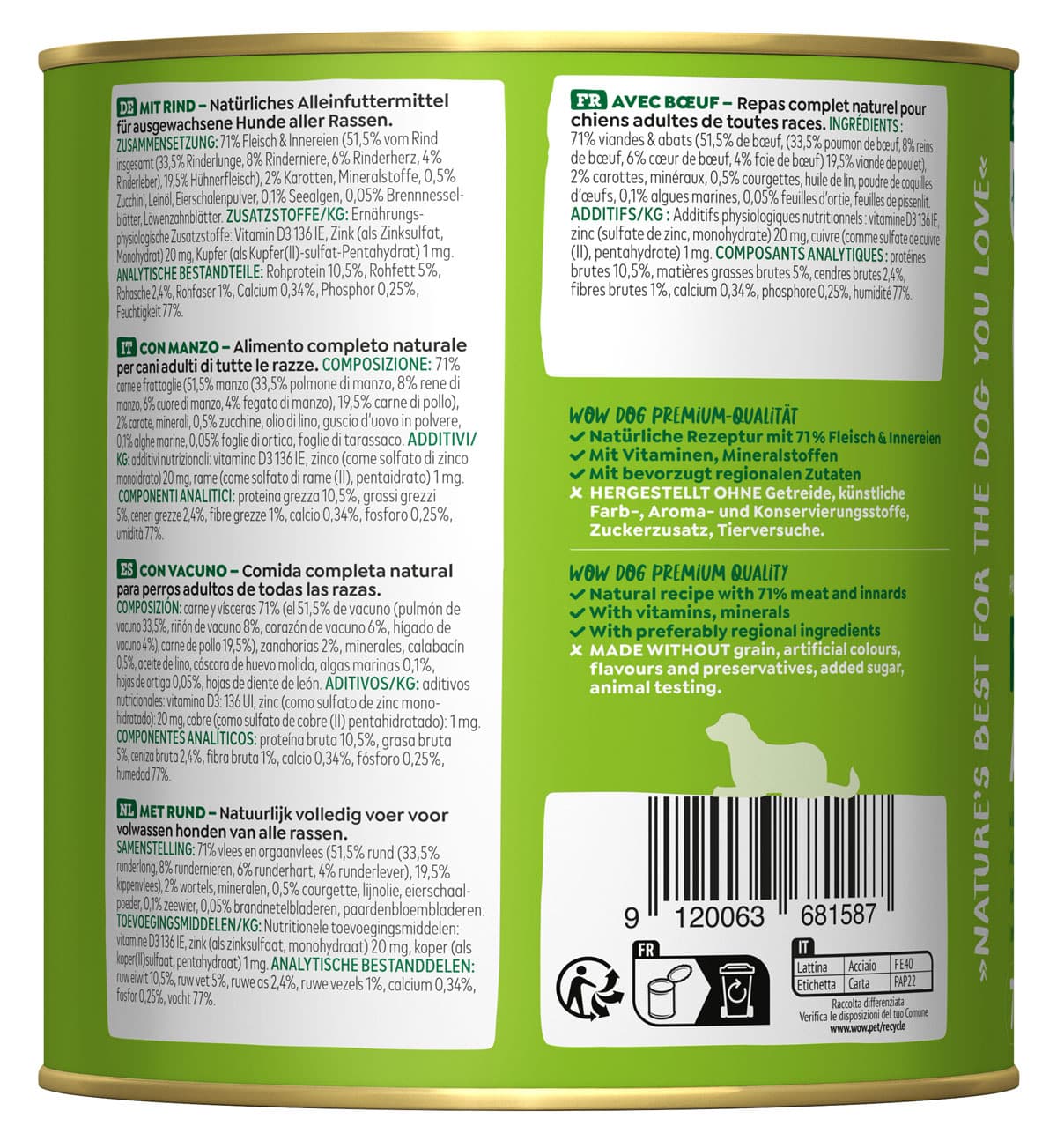 | Fütterungsempfehlung | Dose Adult 400/800g: 5kg: 200-400g, 10kg: 400-600g, 20kg: 600-950g, 30kg: 950-1400g, +40kg: 1400+g. |