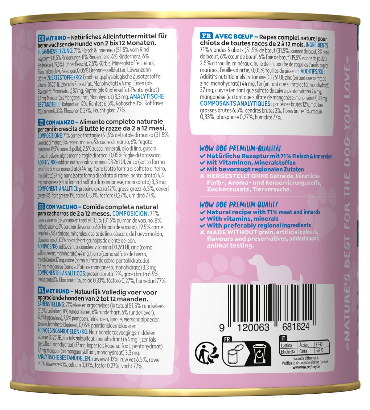Zusammensetzung (Futter)71 % Fleisch & Innereien (51,5 % vom Rind insgesamt (31,5 % Rinderlunge, 8 % Rinderniere, 6 % Rinderherz, 6 % Rinderleber), 19,5 % Hühnerfleisch), 2,5 % Kürbis, Mineralstoffe, Leinöl, Eierschalenpulver, Seealgen, 0,05 % Brennnesselblätter, Löwenzahnblätter.