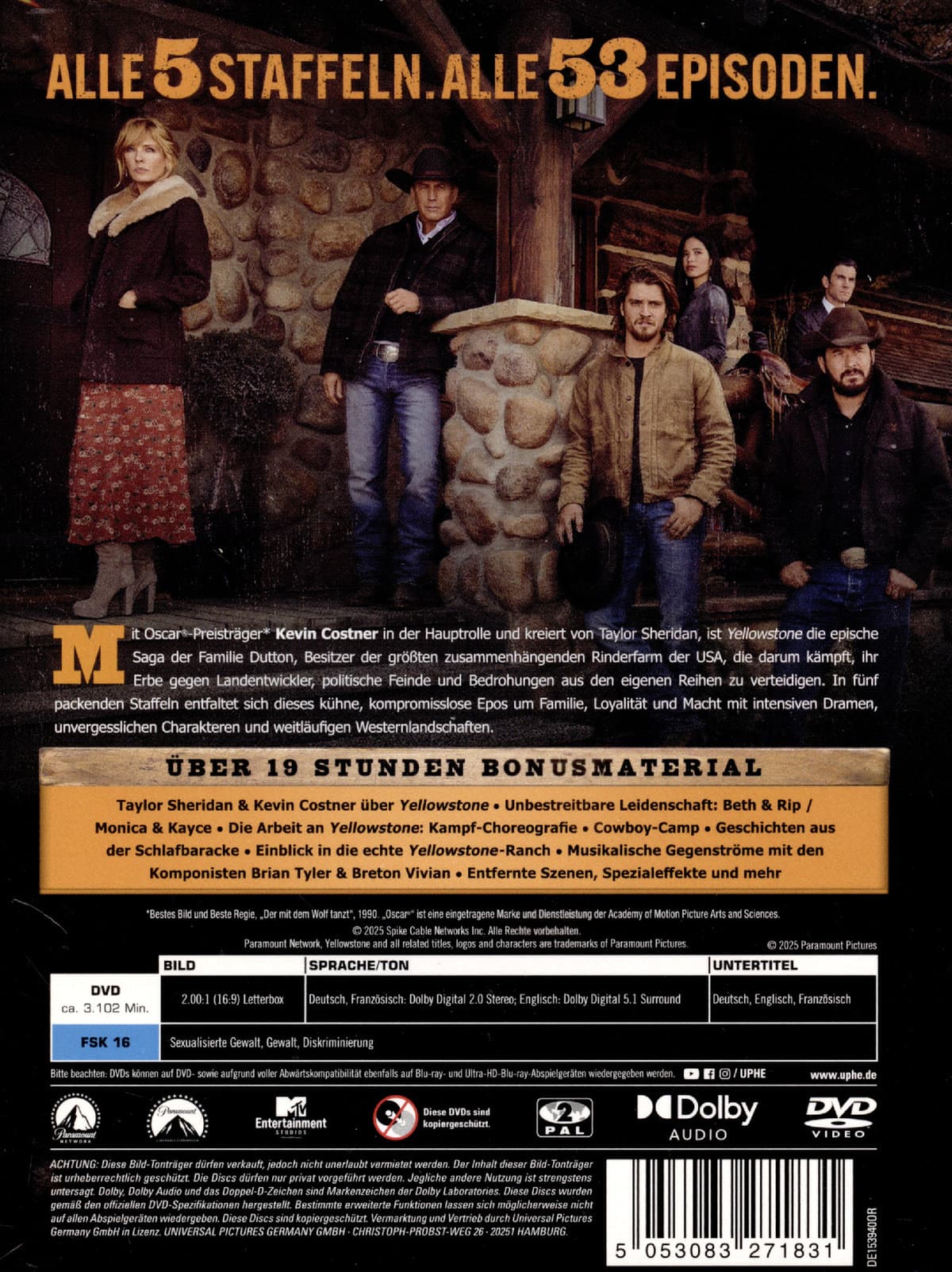 | Zusatzinfos / Bonusmaterial beim Film dabei | Über 19 Stunden Bonusmaterial,Taylor Sheridan & Kevin Costner über "Yellowstone",Unbestreitbare Leidenschaft: Beth & Rip / Monica & Kayce,Die Arbeit an "Yellowstone": Kampf-Choreografie,Cowboy-Camp,u.v.m. |