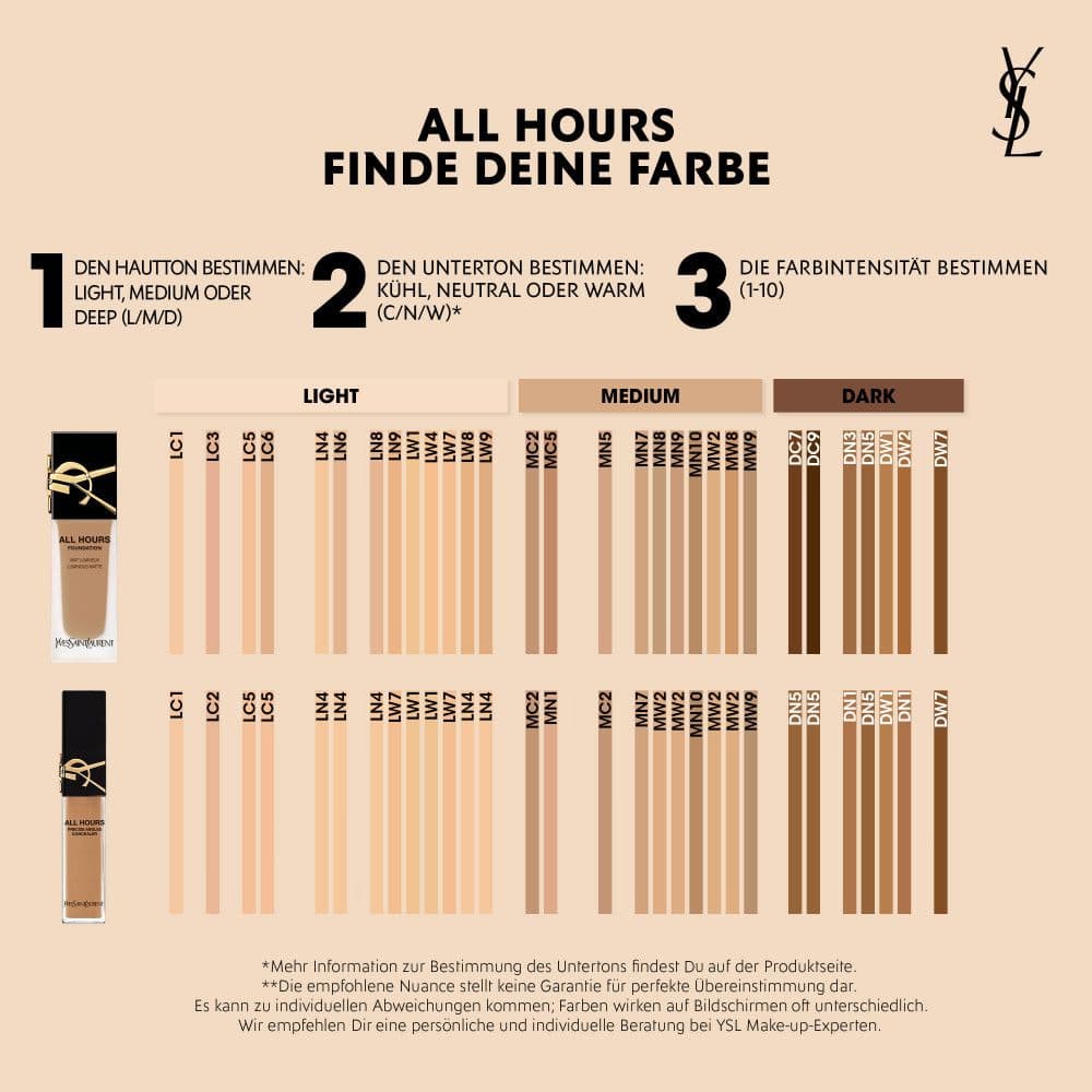| Anwendungshinweis | Der All Hours Concealer von YSL Beauté kann punktuell als auch großflächig verwendet werden. Für einen punktuellen Auftrag die Applikatorspitze auf die gewünschte Position aufsetzen und sanft verblenden. Um den Concealer großflächig anzuwenden, die breiten Seiten nutzen. Für das Korrigieren von Unreinheiten sowie das Ausgleichen von dunklen Stellen sollte die Nuance entsprechend des Hauttons bzw. eine Nuance heller gewählt werden. Zum Konturieren und Hervorheben empfehlen sich dunklere Nuancen. |