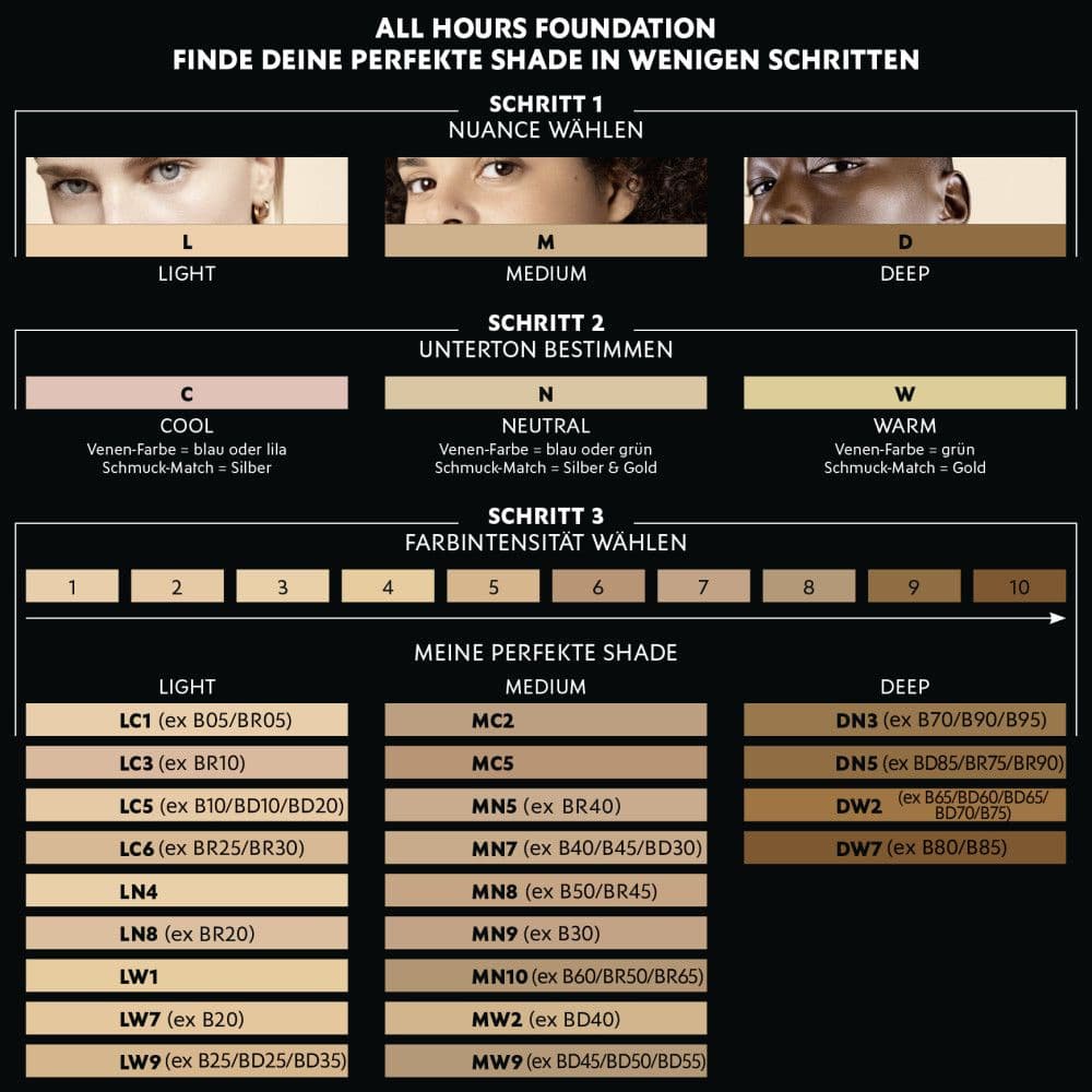 AnwendungshinweisGib einige Tropfen ALL HOURS FOUNDATION von Yves Saint Laurent Beauté auf den Handrücken. Verwende einen Make-up-Pinsel, Deine Finger oder ein Schwämmchen, um die Foundation zu verteilen. Tupfe die Foundation auf Stirn, Wangen, Nase und Kinn. Verblende anschließend die matte Foundation von der Gesichtsmitte nach außen. Dabei darauf achten, dass die Foundation gut verblendet ist. Das gilt besonders für den Hals, die Ohren und den Haaransatz.