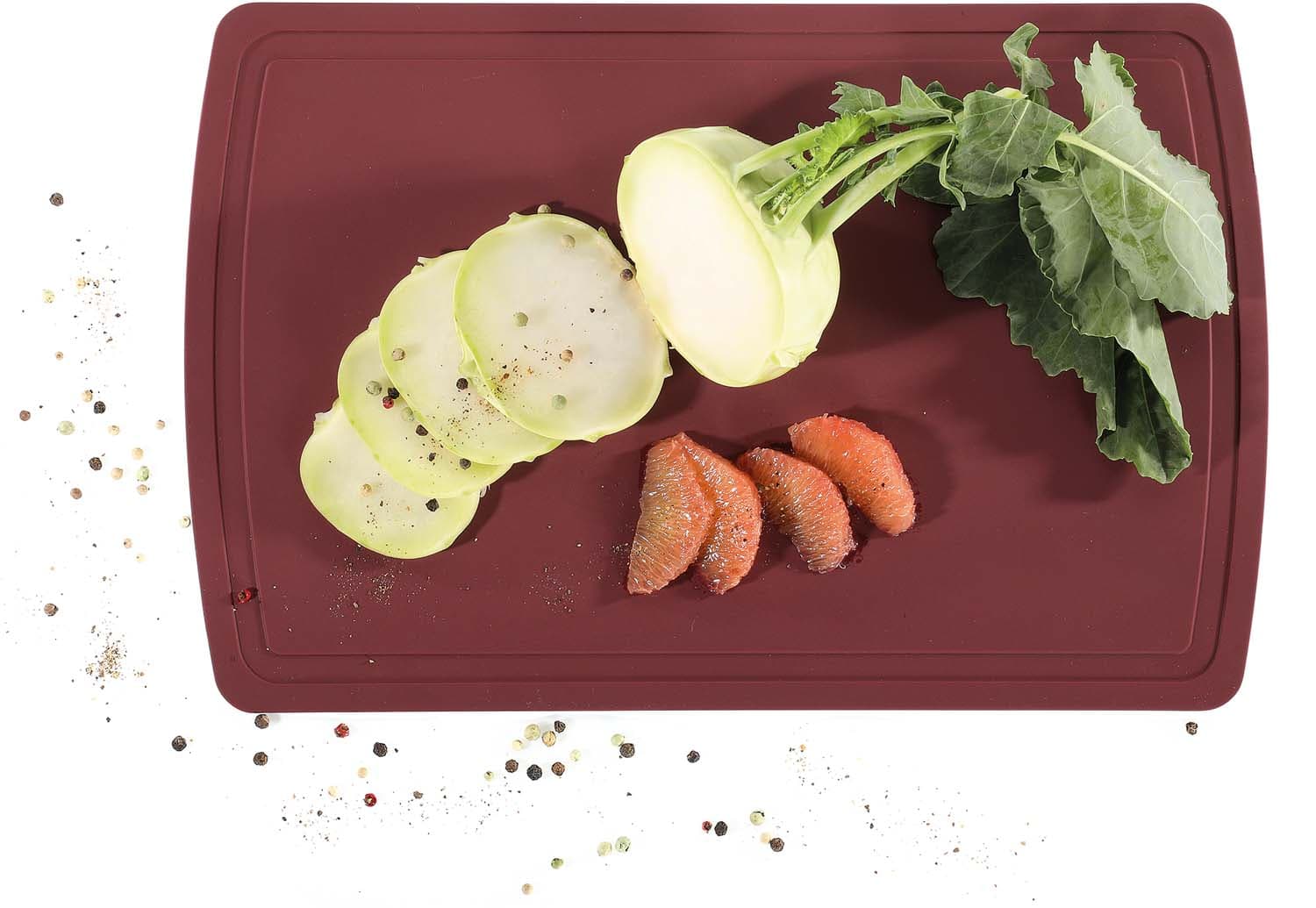 Aus hochwertigem, flexiblem und formstabilem Kunststoff (TPU), schnittfest, messerschonend, spülmaschinenfest, sterilisierbar in kochendem Wasser, hitzebeständig bis 150° C.
