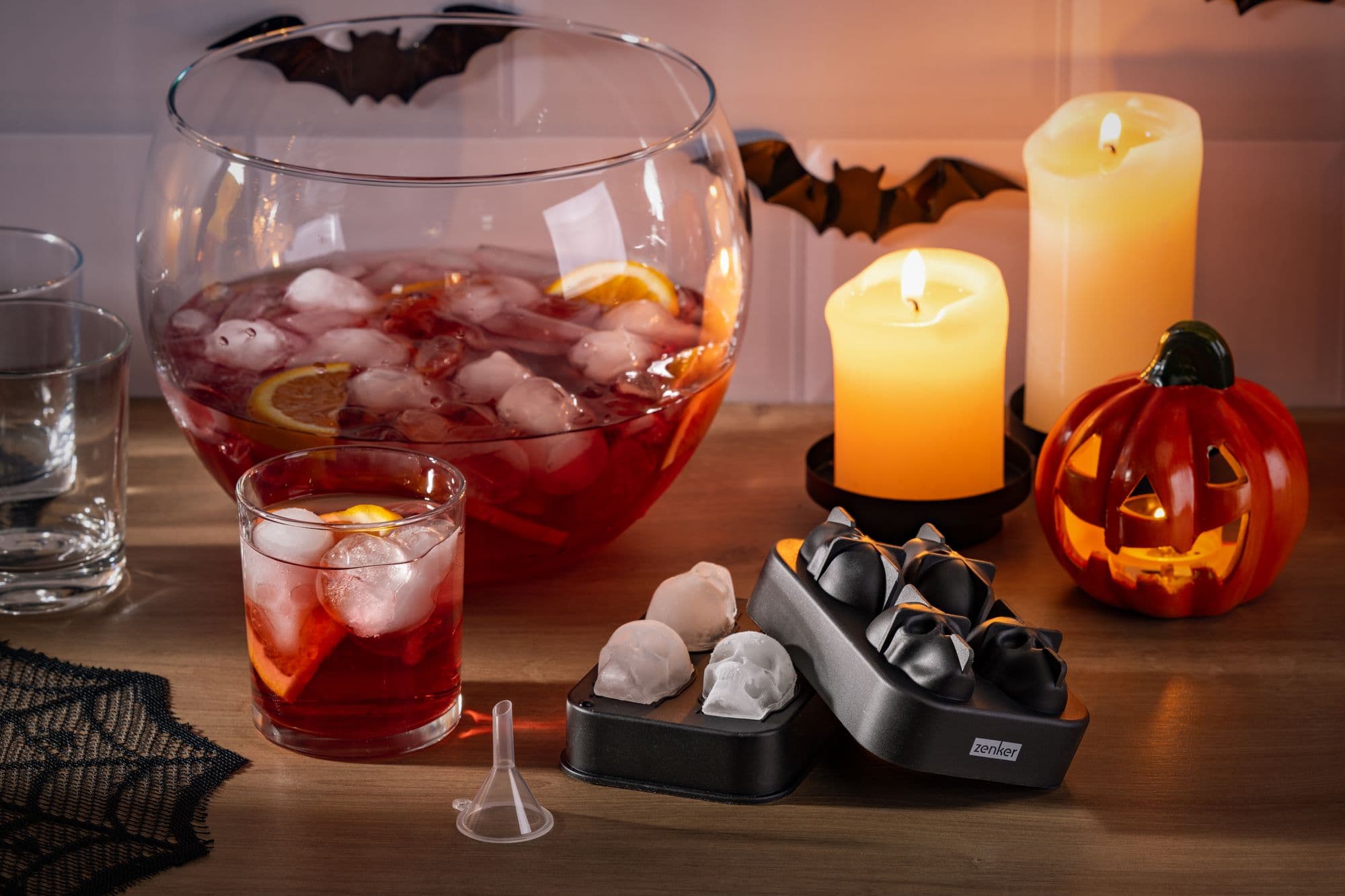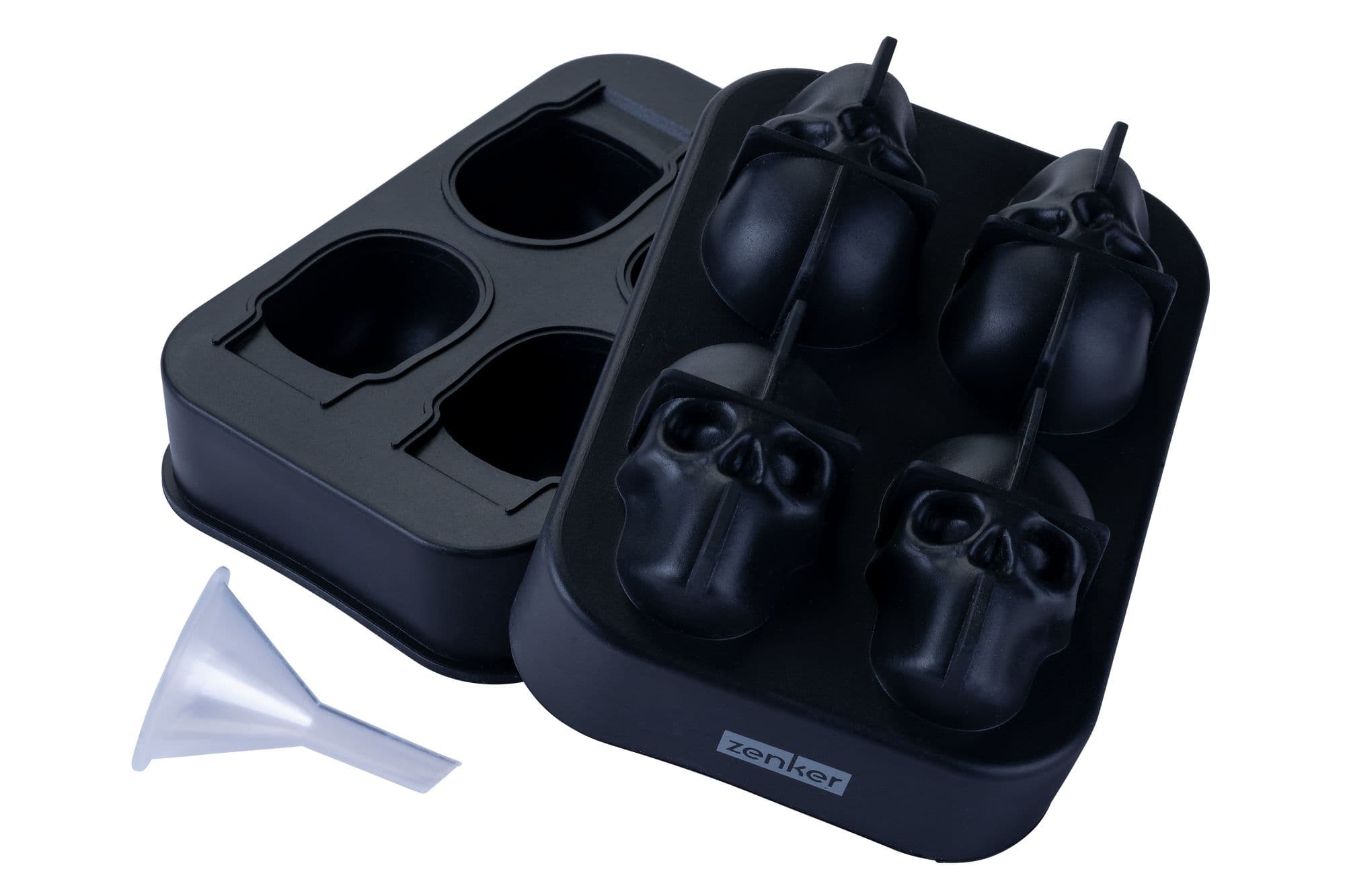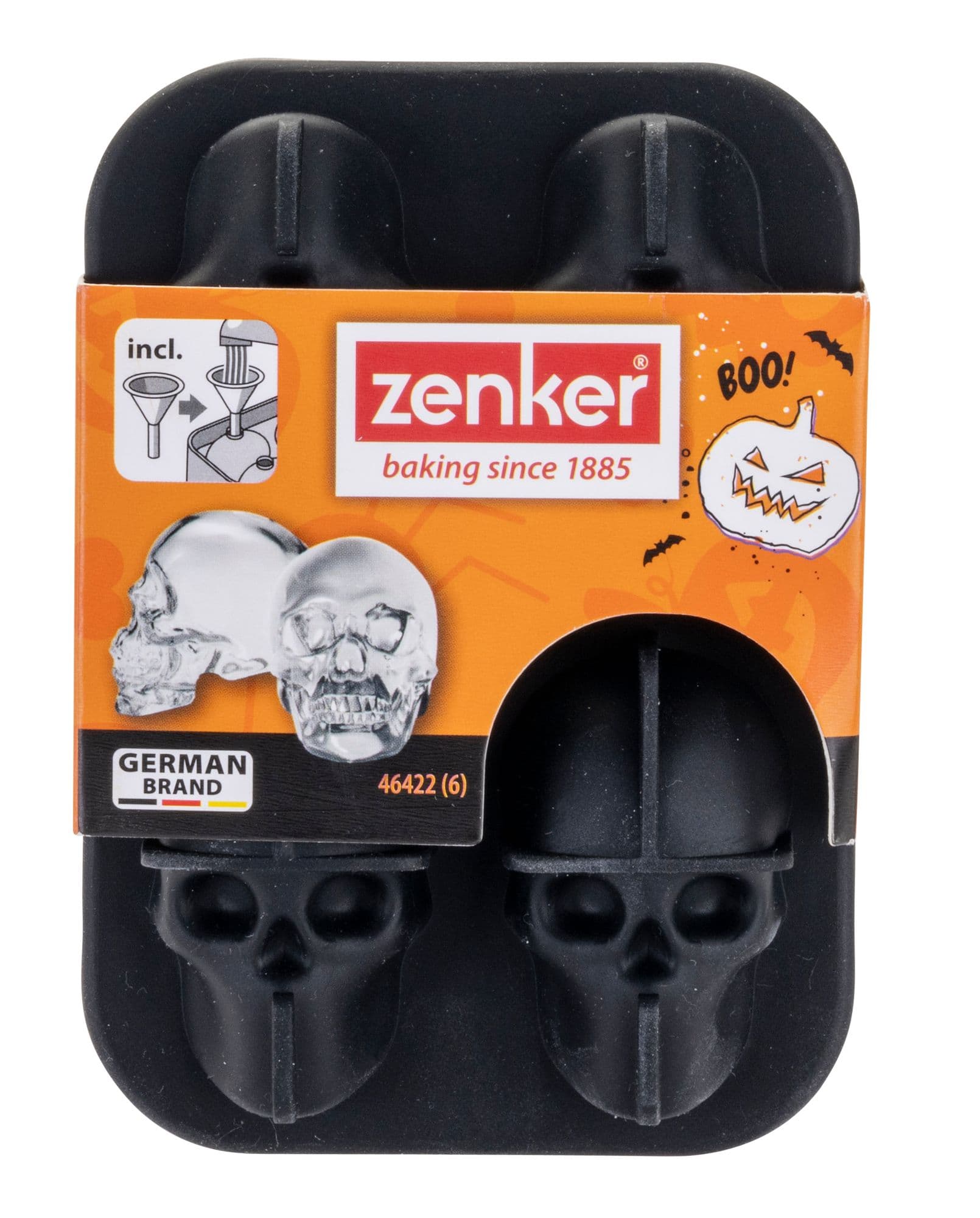 Die Eiswürfelform von Zenker in Form von Totenköpfen ist ideal für Halloween-Partys. Sie besteht aus schwarzem Silikon und wird mit einem transparenten Trichter aus Kunststoff geliefert. Dieser ist nicht für die Nutzung in Gefrierfach, Backofen und Mikrowelle vorgesehen ist, sondern dient nur zum Befüllen. Mit den Maßen von 11 x 8 x 5cm ist die Form leicht zu handhaben. Sie ist spülmaschinen-, mikrowellen-, backofen- und gefriergeeignet von -40°C bis +230°C.