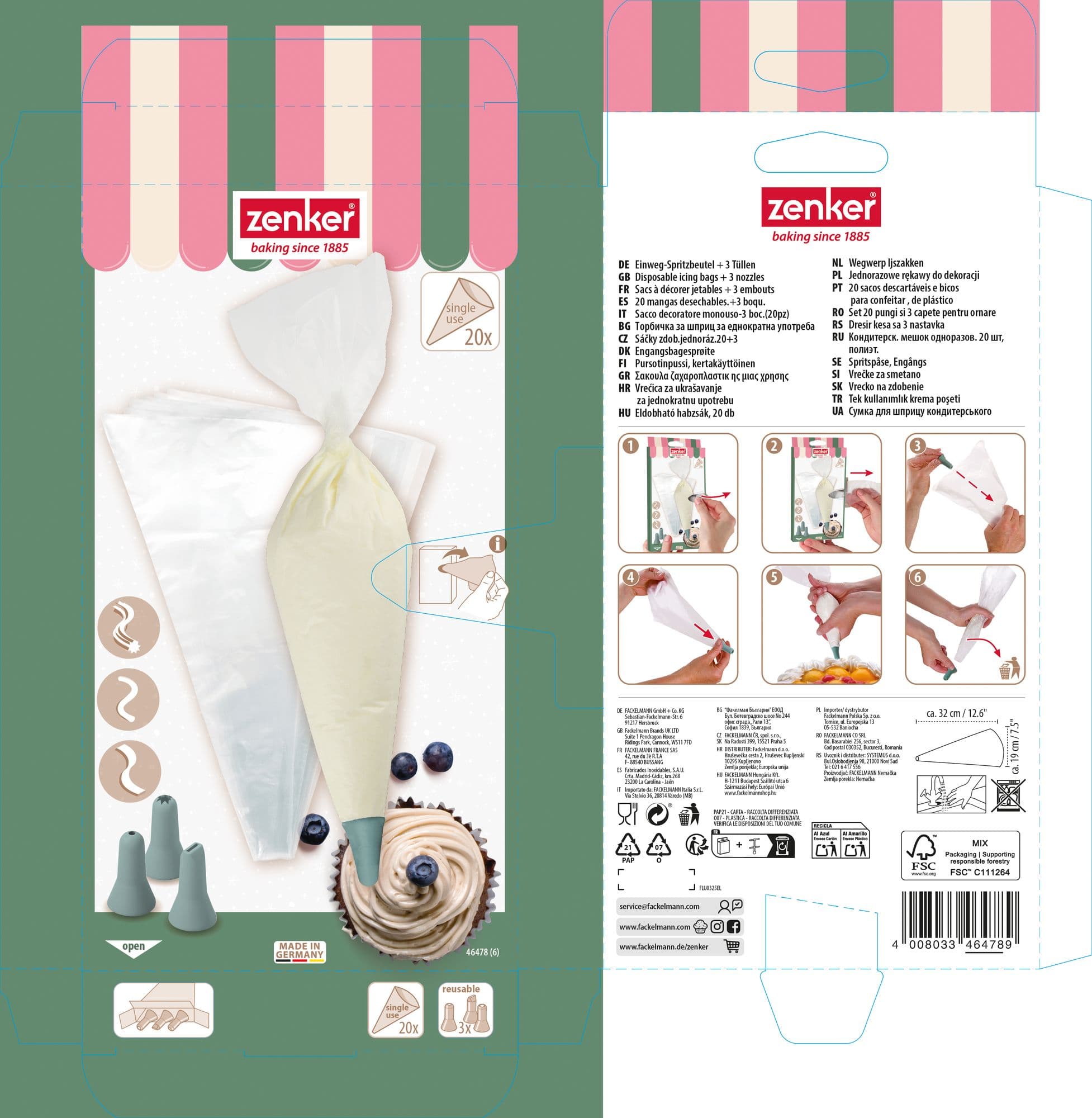 Das 4-teilige Set von Zenker enthält einen Einweg-Spritzbeutel und drei wiederverwendbare Tüllen in Mintgrün – perfekt zum kreativen Verzieren von Kuchen, Torten und Cupcakes. Die transparenten Beutel aus Kunststoff sind leicht zu handhaben und dank Aufreißlasche schnell einsatzbereit. Die robusten Tüllen lassen sich einfach per Hand reinigen. Ideal für die Weihnachtsbäckerei und andere festliche Anlässe.